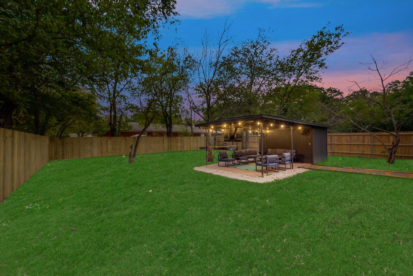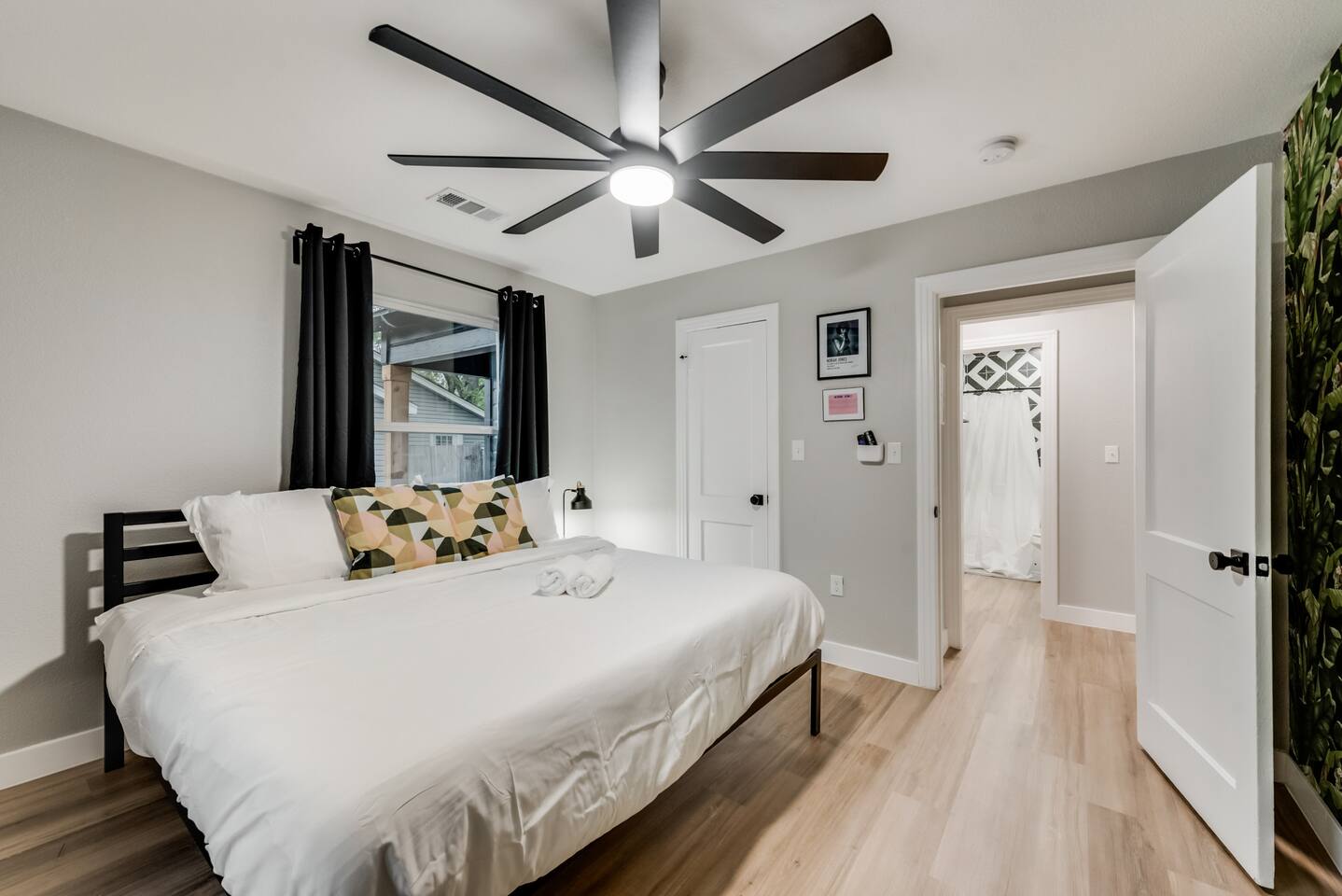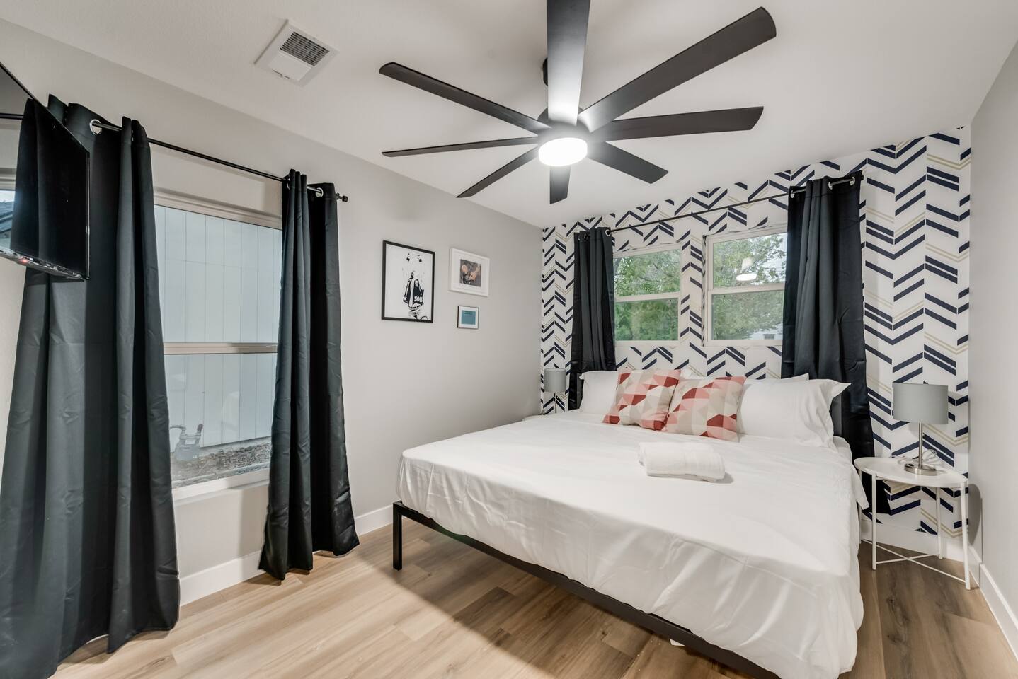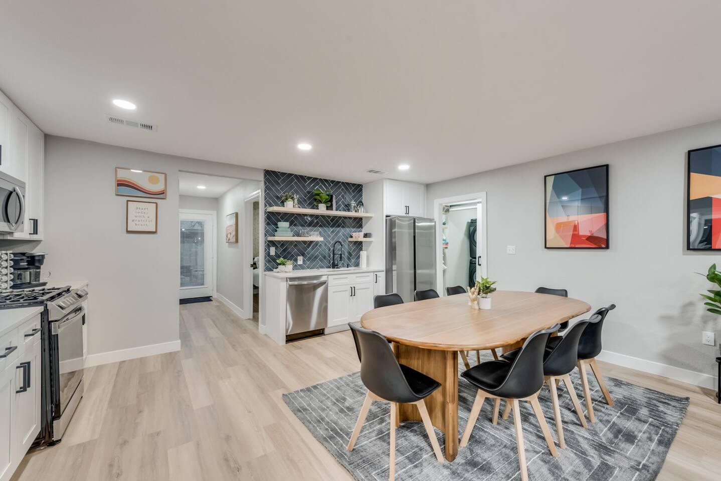 ★☆ Key Features ☆★ ☀ Sleeps 10+ comfortably: 5 bedrooms, all with king beds ☀ 3 full bathrooms stocked with essentials ☀ Fully equipped kitchen with modern appliances ☀ Smart TVs in every bedroom + fast Wi-Fi ☀ In-unit washer and dryer for convenience ☀ Pet-Friendly with a large fenced backyard ☀ Walking distance to UNT & a short drive to Denton Square ☆☆ BEDROOMS ☆☆ Each of the 5 bedrooms is furnished with a luxurious king-sized bed, fresh linens, and a smart TV. Ideal for large families, work groups, or friend getaways seeking both comfort and privacy. ☆☆ BATHROOMS ☆☆ Enjoy 3 full bathrooms, stocked with towels, toiletries, and shower essentials—making mornings smooth and easy for groups of any size. ☆☆ KITCHEN & LIVING ☆☆ Cook with ease in the modern kitchen—complete with full-size appliances, cookware, dishes, and a coffee maker. The open living space includes plush seating and another smart TV for relaxing nights in. ☆☆ OUTSIDE SPACE ☆☆ Step outside to a large fenced yard, perfect for pets or kids to play safely. Whether you're sipping coffee in the morning or enjoying the evening breeze, this backyard delivers privacy and comfort. ★☆ Book now and enjoy a relaxing stay in the heart of Denton! ☆★