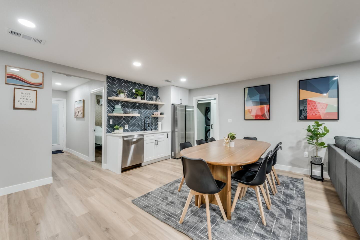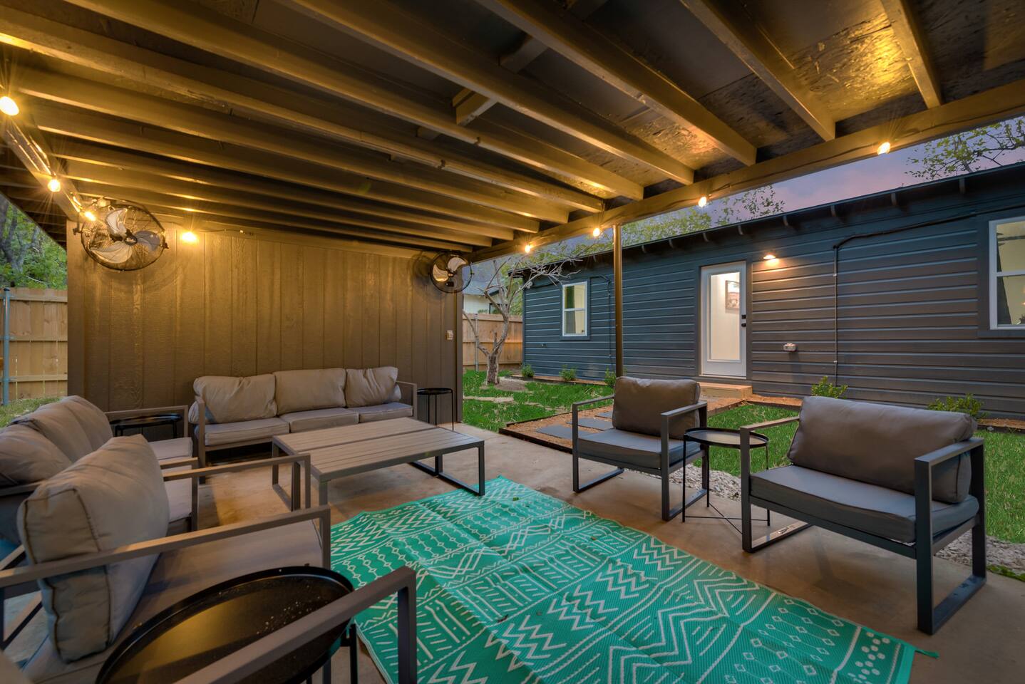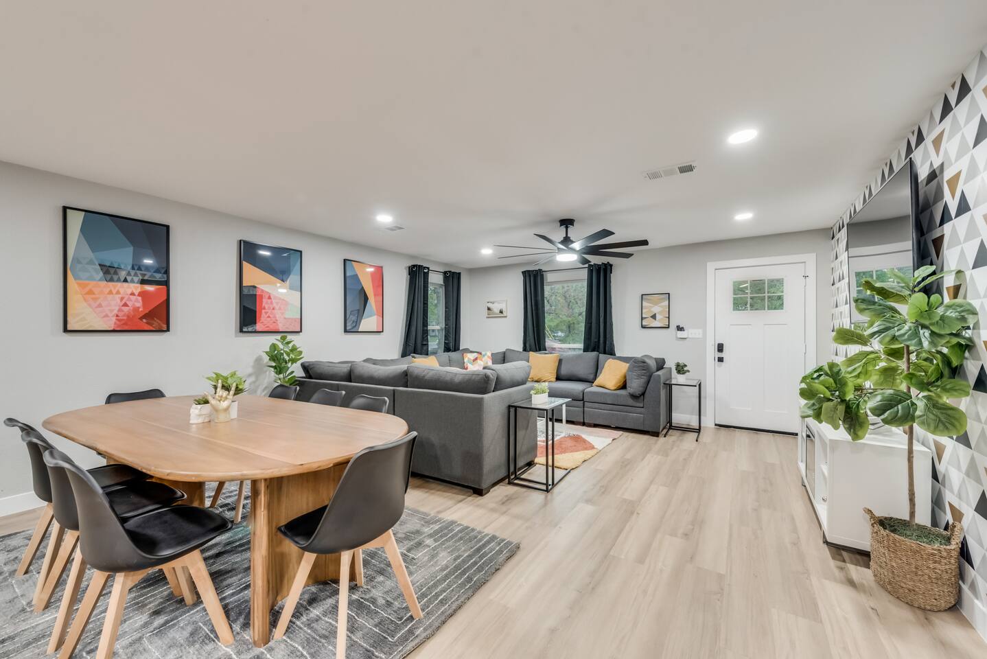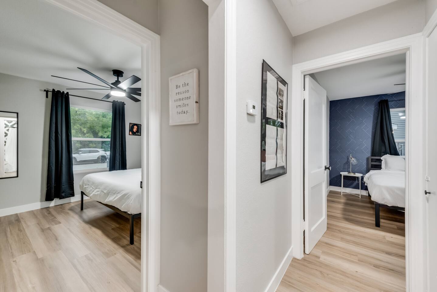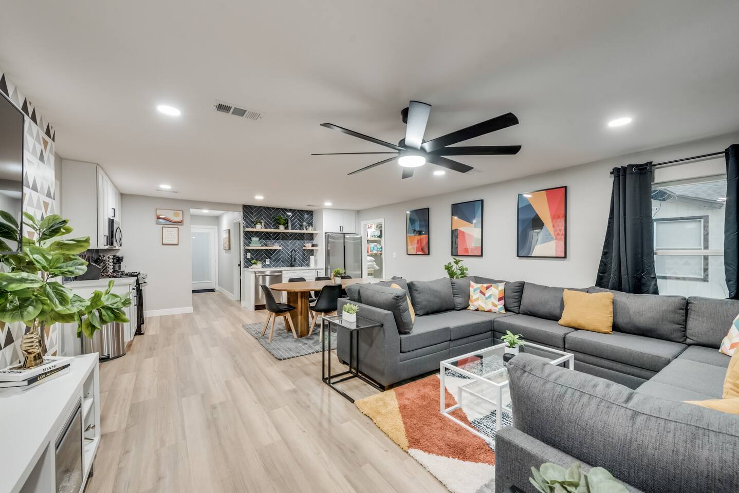 ★☆ Key Features ☆★ ☀ Sleeps 10+ comfortably: 5 bedrooms, all with king beds ☀ 3 full bathrooms stocked with essentials ☀ Fully equipped kitchen with modern appliances ☀ Smart TVs in every bedroom + fast Wi-Fi ☀ In-unit washer and dryer for convenience ☀ Pet-Friendly with a large fenced backyard ☀ Walking distance to UNT & a short drive to Denton Square ☆☆ BEDROOMS ☆☆ Each of the 5 bedrooms is furnished with a luxurious king-sized bed, fresh linens, and a smart TV. Ideal for large families, work groups, or friend getaways seeking both comfort and privacy. ☆☆ BATHROOMS ☆☆ Enjoy 3 full bathrooms, stocked with towels, toiletries, and shower essentials—making mornings smooth and easy for groups of any size. ☆☆ KITCHEN & LIVING ☆☆ Cook with ease in the modern kitchen—complete with full-size appliances, cookware, dishes, and a coffee maker. The open living space includes plush seating and another smart TV for relaxing nights in. ☆☆ OUTSIDE SPACE ☆☆ Step outside to a large fenced yard, perfect for pets or kids to play safely. Whether you're sipping coffee in the morning or enjoying the evening breeze, this backyard delivers privacy and comfort. ★☆ Book now and enjoy a relaxing stay in the heart of Denton! ☆★